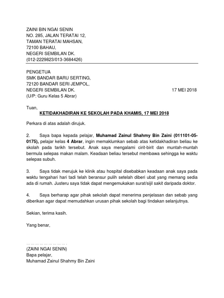 Surat tunjuk sebab lewat hantar tuntutan perjalanan sip. Surat tunjuk sebab tidak hadir mp3 & mp4. Guru kelas tingkatan 1 cerdik)5 oktober 2020tuan/puan,memohon pengecualian kehadiran ke sekolah atas kebimbangan penularan. Download 6 contoh surat rasmi tidak hadir ke sekolah/kuliah untuk sebab seperti cuti sakit, bercuti luar, urusan keluarga, balik kampung, melawat orang sakit, berlaku kematian. Bagaimanakah cara menulis surat tidak hadir ke sekolah secara formal?