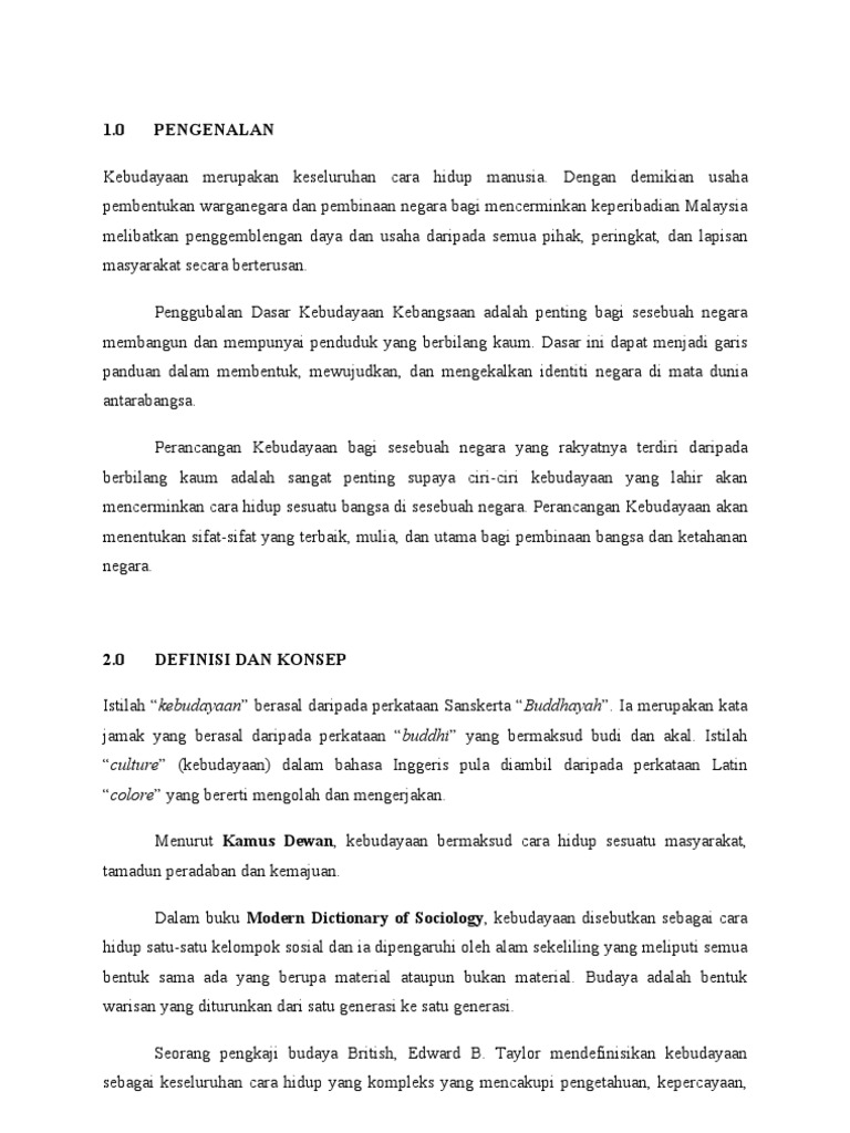 Dasar Kebudayaan Kebangsaan from imgv2-1-f.scribdassets.com Memenuhi tuntutan keadilan dan kepastian hukum dengan cara merealisasikan. .dalam dasar kebudayaan kebangsaan 1971 tidak menggadaikan tiga prinsip yang menjadi asas utama dalam pembentukan dasar tersebut. Dasar kebudayaan kebangsaan (dkk) menjadikan islam dan budaya melayu sebagai teras tetapi tidak hingga menyingkirkan nilai baik secara umum kebudayaan lain. Wawasan kebangsaan dapat juga diartikan sebagai cara memandang / sudut pandang yang mengandung kemampuan seseorang atau kelompok wawasan kebangsaan indonesia juga dikenal sebagai sebuah pedoman yang masih bersifat filosofia normatif. Mereka juga perlu melahirkan tindakan yang melepasi tembok kepentingan etnik dan kaum. Yaitu cara pandang masyarakat sebagai bagian dari bangsa terhadap diri fungsi dan tujuan wawasan kebangsaan. Antaranya termasuklah pembentukan dasar kebudayaan kebangsaan. Prinsip kedua, iaitu unsur kebudayaan lain yang sesuai lanjutan daripada itu.